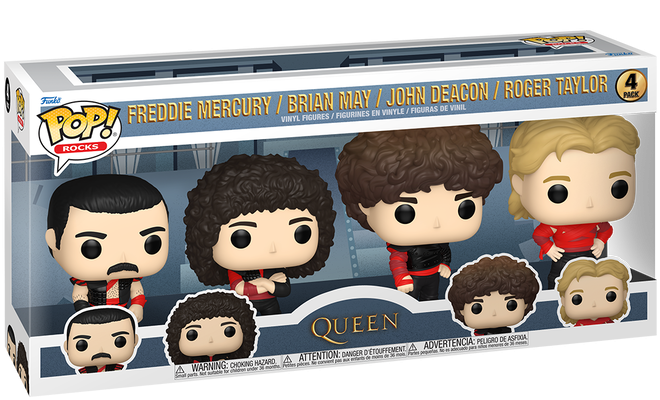 Freddie Mercury, pop! Brian May, pop! John Deacon și Pop! Roger Taylor, așa cum se vede în cântecul lor de succes „Radio Ga Ga”.