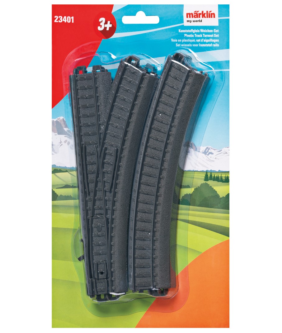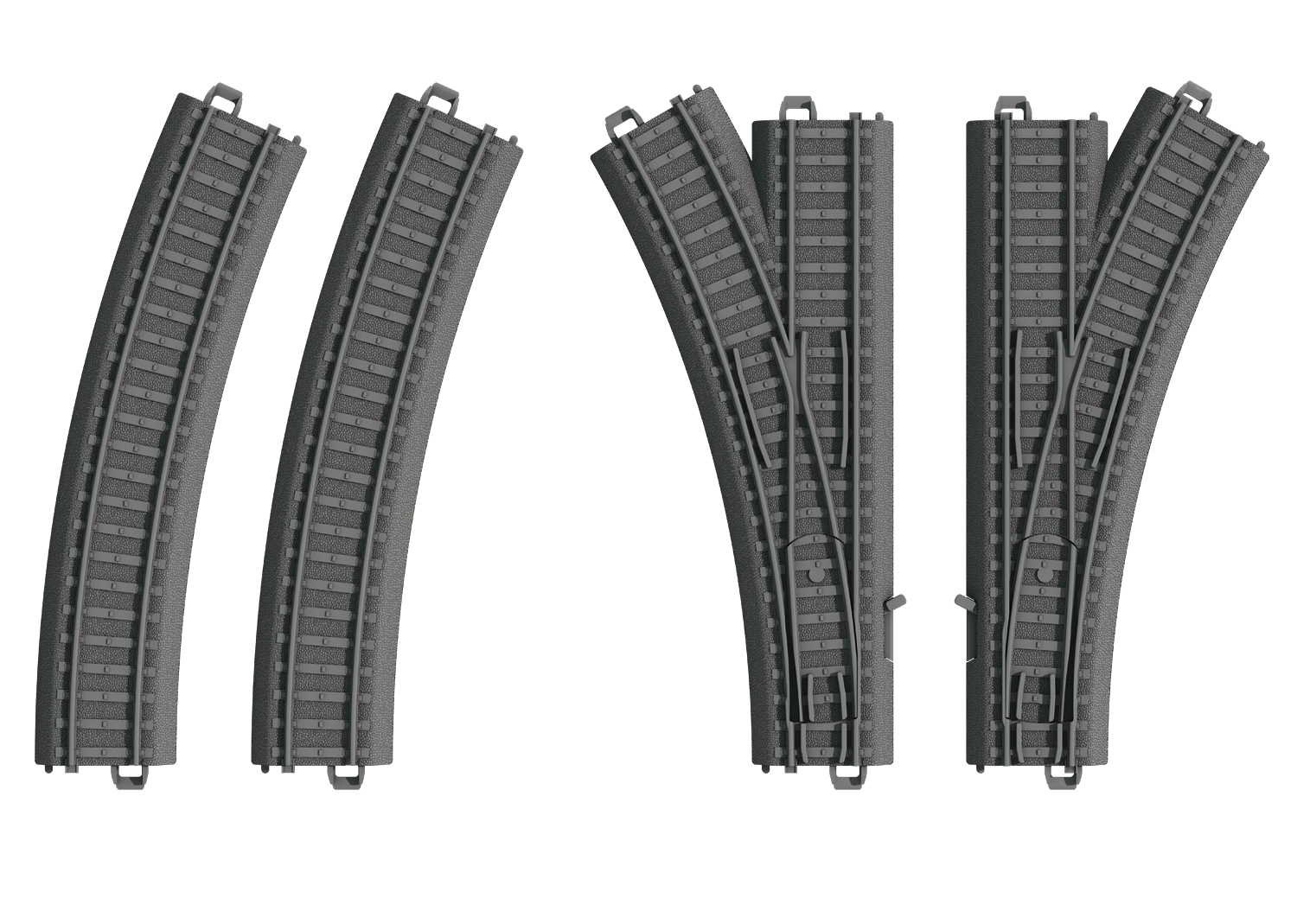 Patru bucăți de șină pentru trenulețe la scara 1:87: curbe, 1 bifurcație la stânga și 1 la dreapta.