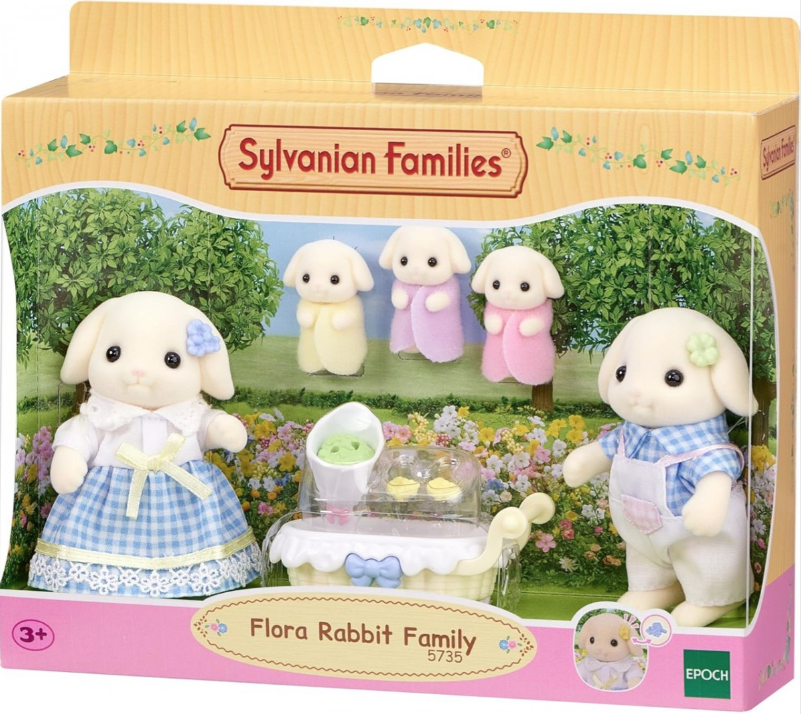Setul de Figurine Sylvanian Families - Familia Iepurasilor Flora este format din cele cinci personaje: tatal iepuras Nolan Flora, mama Aria Flora si tripletii: Thyme, Sage si Rosemary Flora.