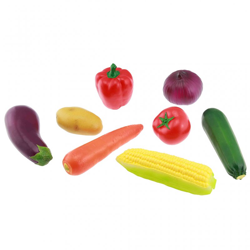 Fructe din lemn, ideale pentru jocurile de rol culinare. Fructele incluse: porumb, ceapă, ardei, vânătă, dovlecel, roșie, morcov, cartof.