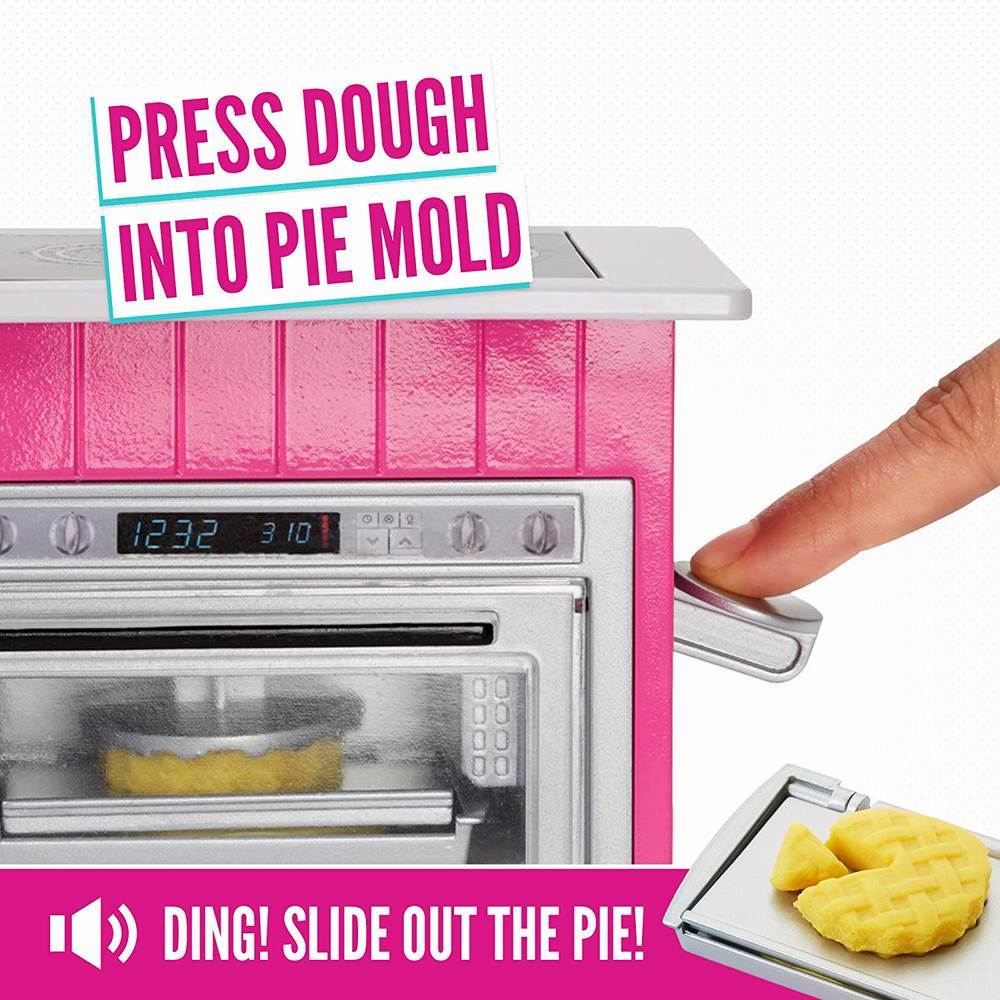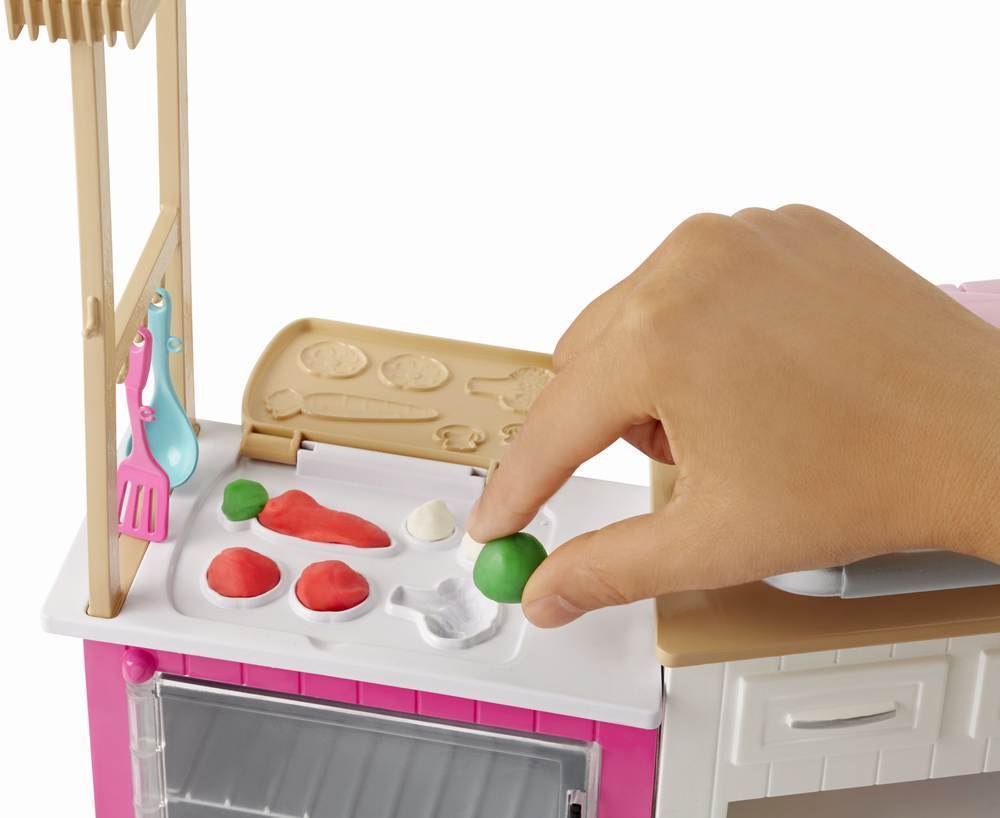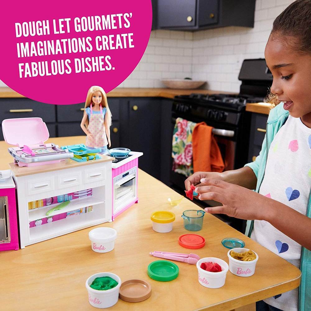 Bucurati-va de povesti noi cu papusa Barbie si noul ei set de bucatarie. Setul include papusa Barbie, bucatarie, aparate, ustensile de gatit si de masa si cinci culori diferite de aluat pentru a face produse alimentare. Papusa Barbie este gata pentru a gati si a servi in sort sef si pantofi.