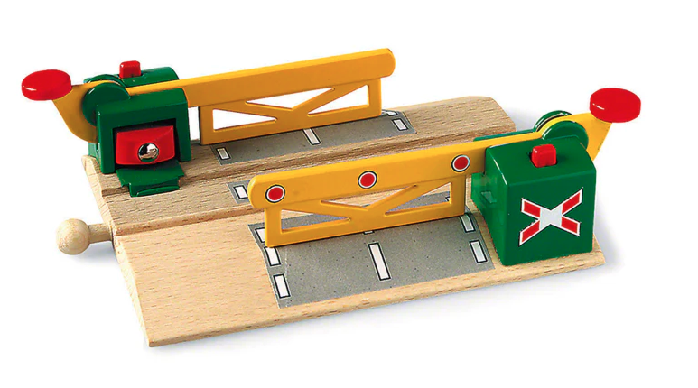 Traficul rutier este oprit cu puterea magnetismului atunci cand trece trenul. Apasa butonul pentru a ridica bariera si a lasa masinutele sa treaca.