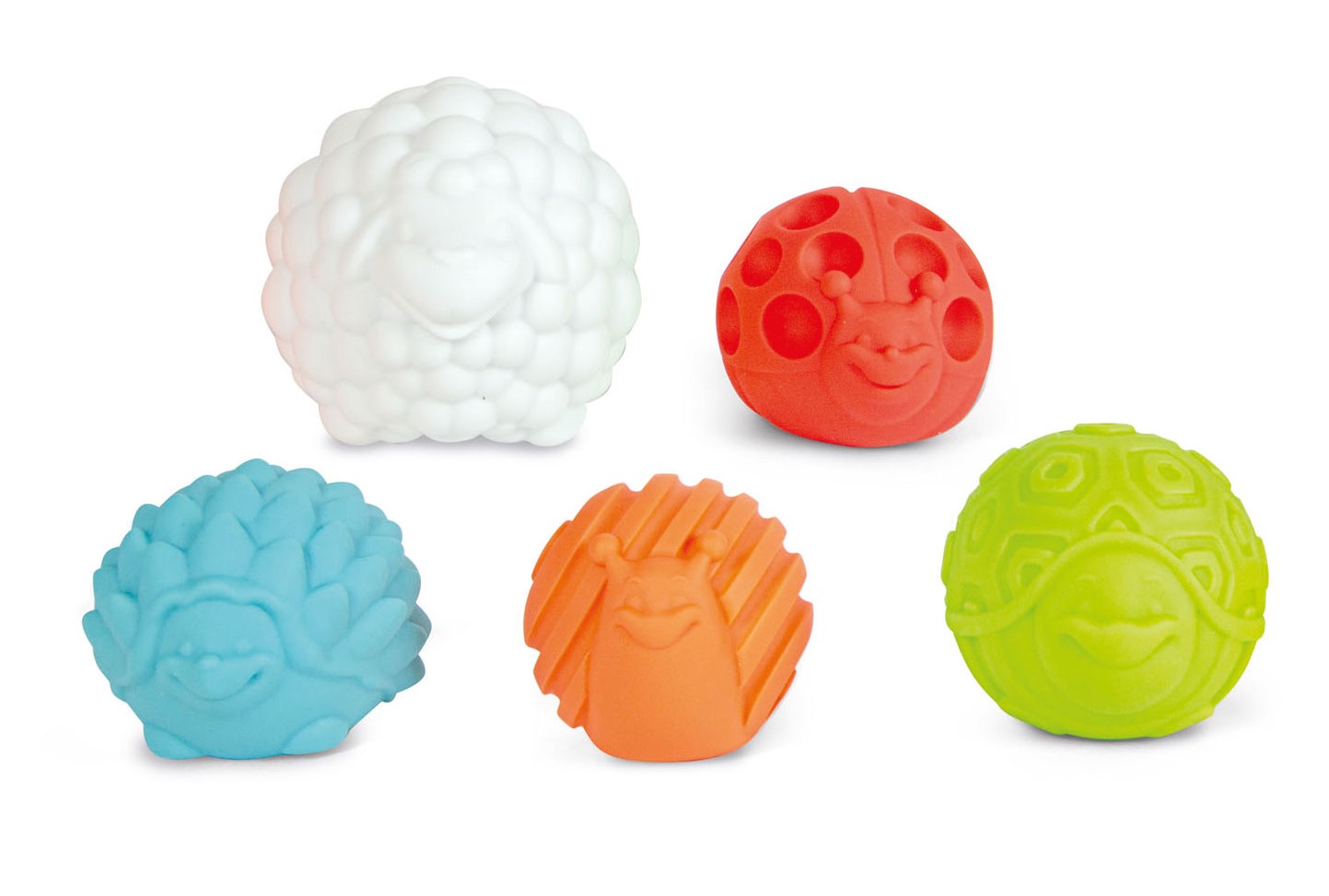 Un set colorat format din 5 bile senzoriale în formă de diferite animale, cu culori, texturi și dimensiuni diferite.