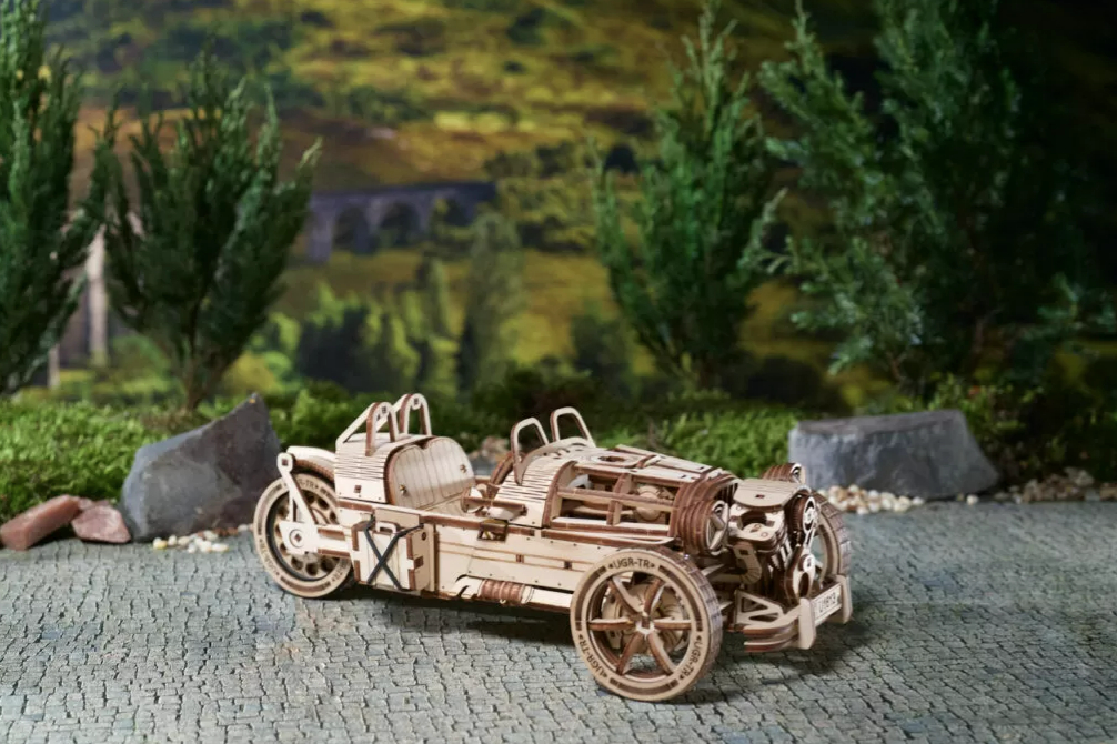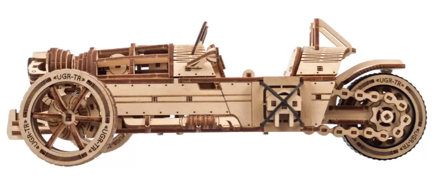 Vehiculul cu trei roți UGR-S este cea mai recentă și mai tare adăugare la colecția de motociclete și automobile Ugears. Acest elegant cu două locuri este un drum cu trei roți și un porc de atenție, cu tracțiune cu arc, suspensie față și spate, un volan funcțional care rotește roțile din față la stânga și la dreapta și o mulțime de detalii excelente, cum ar fi pistoane în mișcare, faruri mari, personalizate. țevi de eșapament care trec de-a lungul lateral, o valiză de plasat în suportul pentru bagaje montat lateral și gravare cu laser. Și asta nu este tot: ridicați cele două părți ale capotei motorului pentru a vedea rezervorul de benzină și motorul arcului!