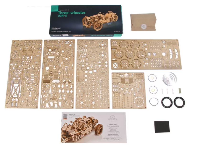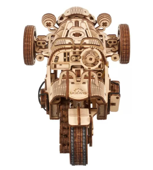Vehiculul cu trei roți Ugears UGR-S poate parcurge aproximativ 4 metri în linie dreaptă sau poate întoarce roțile folosind volanul sau cu mâna pentru virajele grațioase. Grupul motopropulsor al vehiculului cu trei roți UGR-S include motorul cu arc și o transmisie unică cu lanț la roata din spate - o premieră în catalogul Ugears. Pentru acel factor „wow” adăugat pentru care este cunoscut Ugears, există două pistoane mobile pe motorul decorativ din față. Acest model de tricicletă din lemn DIY are o cheie de înfășurare detașabilă care poate fi depozitată în oricare dintre compartimentele de bagaje de pe lateralul modelului. Puneți schimbătorul de viteze în modul „Parcare”, introduceți cheia în capotă, dați până la 15 rotații, apoi porniți tricicleta prin comutarea schimbătorului de viteze în modul „Drive”. Urmăriți aceste frumoase pistoane și lanțuri în acțiune în timp ce tricicleta pornește în direcția dorită. Vehiculul cu trei roți UGR-S este proiectat pentru a vă permite să îl împingeți cu mâna, fără a activa motorul arcului.