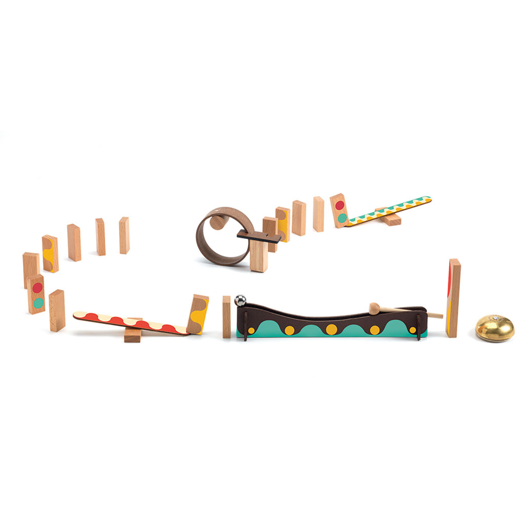 Joc de construcție cu 22 de piese din lemn, 2 bile metalice și un clopoțel metalic, broșură cu instrucțiuni de 16 pagini.