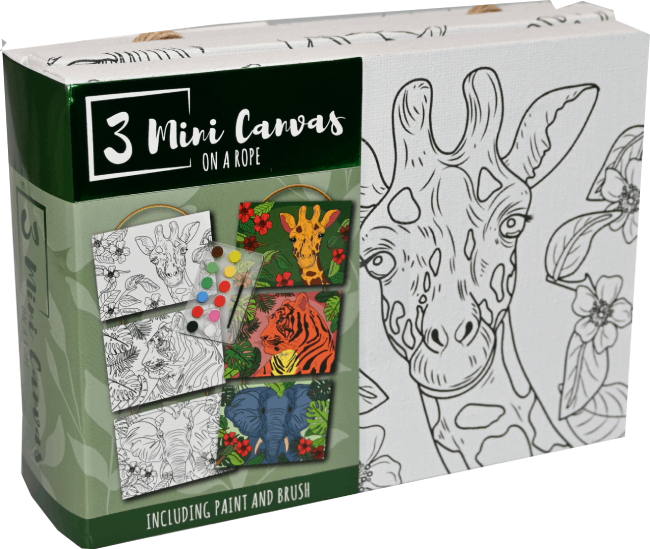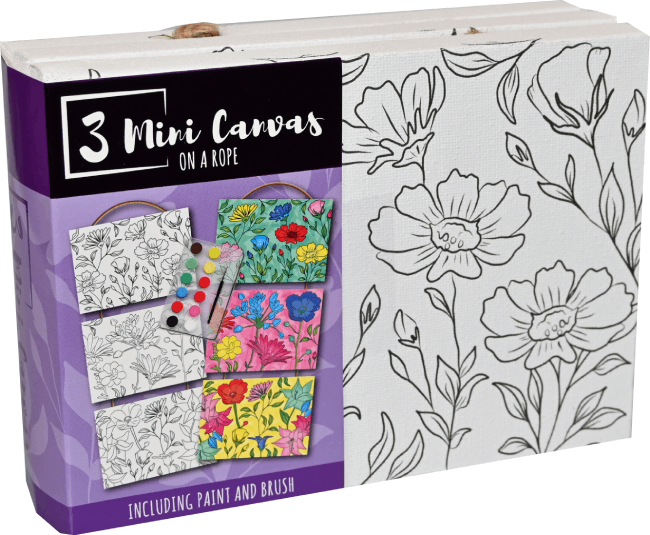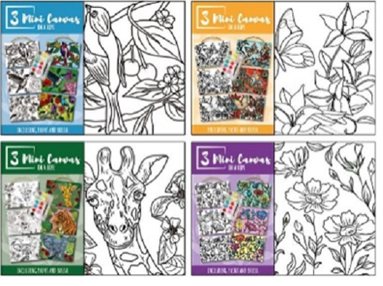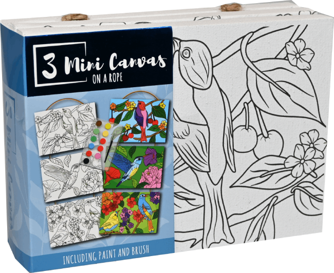 Setul include 3 mini-tablouri din pânză cu desene contur de colorat, prinse între ele cu sfoară, astfel că se pot agăța toate trei pe perete după ce au fost pictate, un set de 12 culori de acuarelă și 1 pensulă.