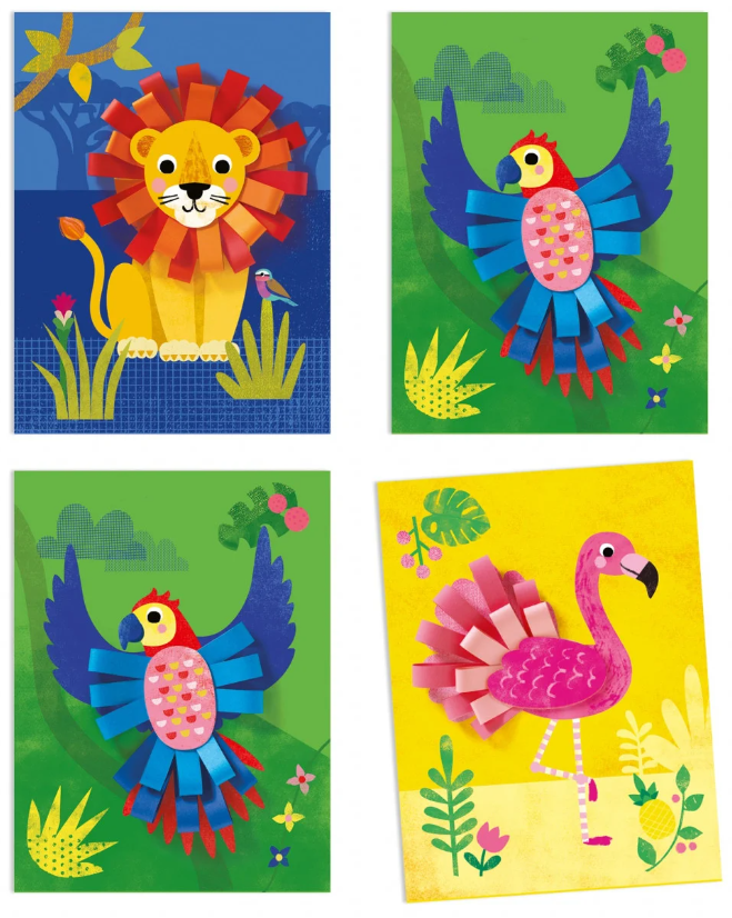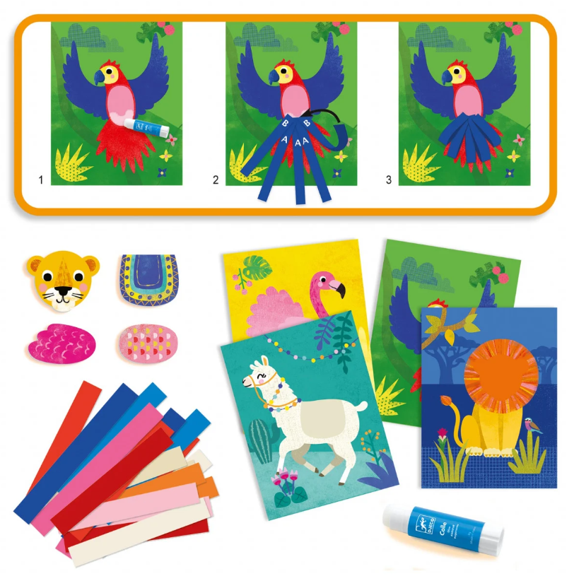 Conținut: 4 planșe ilustrate (21 x 28 cm), fâșii de hârtie colorată, 4 capete de animale din carton, lipici și broșură cu instrucțiuni pas cu pas.
