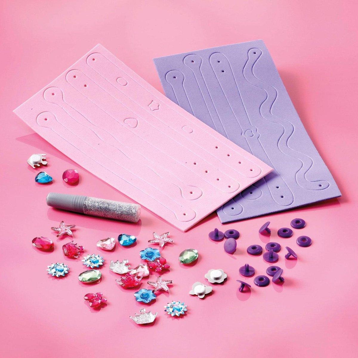Creeaza-ti propriile bratari fashion cu acest set complet cu multe accesorii! Contine: 8 bratari din spuma, 25 strasuri autoadezive, 8 cleme de inchidere, lipici cu sclipici, un ghid.