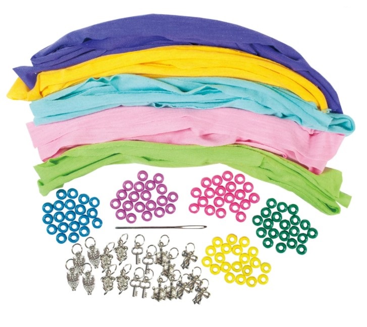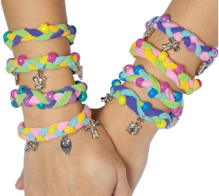 Creați 8 brățări împletite din țesături viu colorate și împodobiți-le cu mărgele și pandantive.