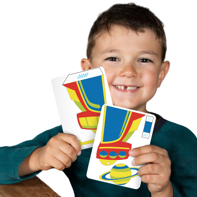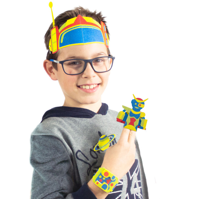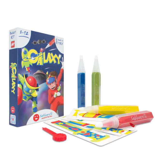Setul conține 4 creioane cu nisip colorat, instrument de dezlipit, 1 bandă elastică și cartonașe pretipărite autocolante pentru a crea un set de accesorii modulare: 1 mini-robot 3D, 1 bandă galactică de purtat, 1 broșă cu inele ale lui Saturn, 1 brățară care simulează panoul de butoane al unei telecomenzi pentru a opera robotul.