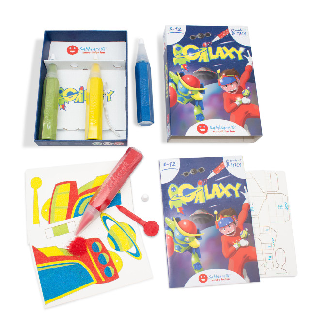 Set creativ de colorat cu nisip cu tematică spațiu.