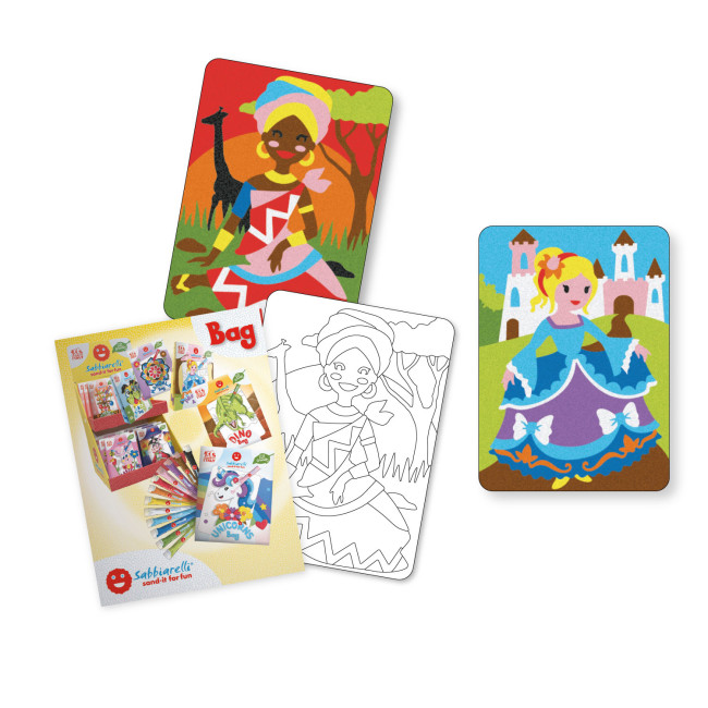 Set creativ de colorat cu nisip 2 desene format A6 cu prințese.