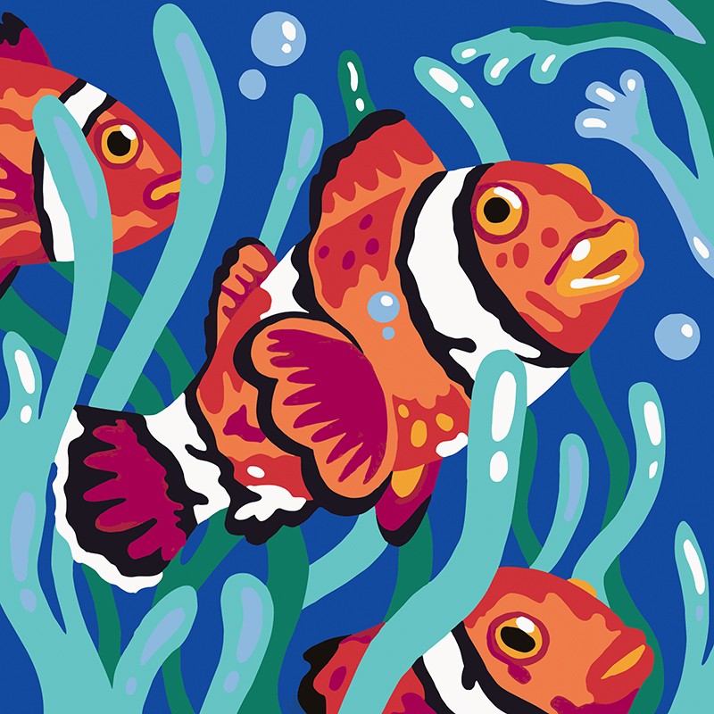 Bucurați-vă de un moment creativ și relaxant creând două tablouri pictând pe numere pești minunați.