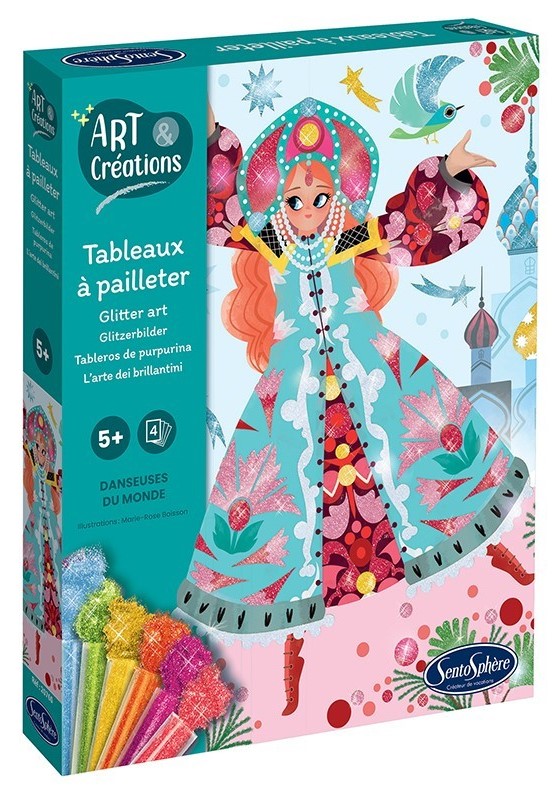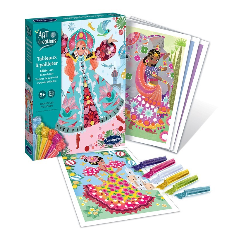 Set de 4 ilustrații cu dansatoare ce pot fi împodobite cu sclipici în câțiva pași simpli: