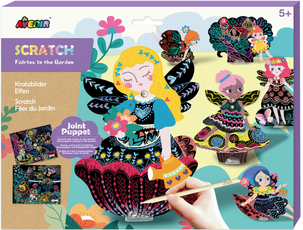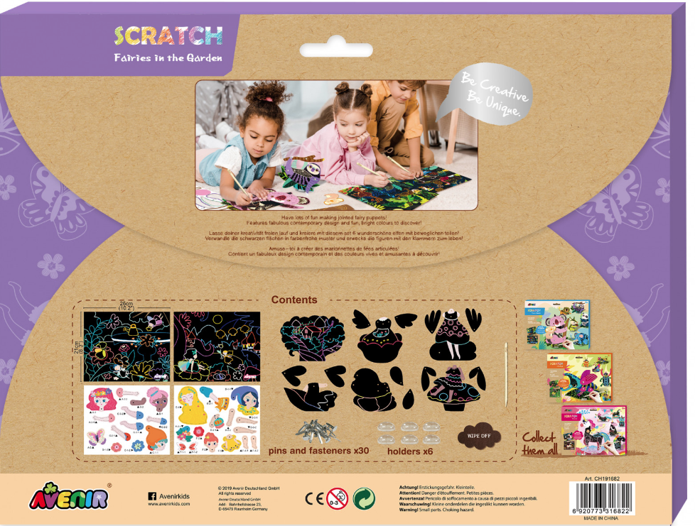 Tot ce trebuie să faceți este să razuiti suprafața neagră cu instrumentul inclus și să folosiți elementele de fixare incluse pentru a crea figurine mobile adorabile cu zane cu care să vă jucați.