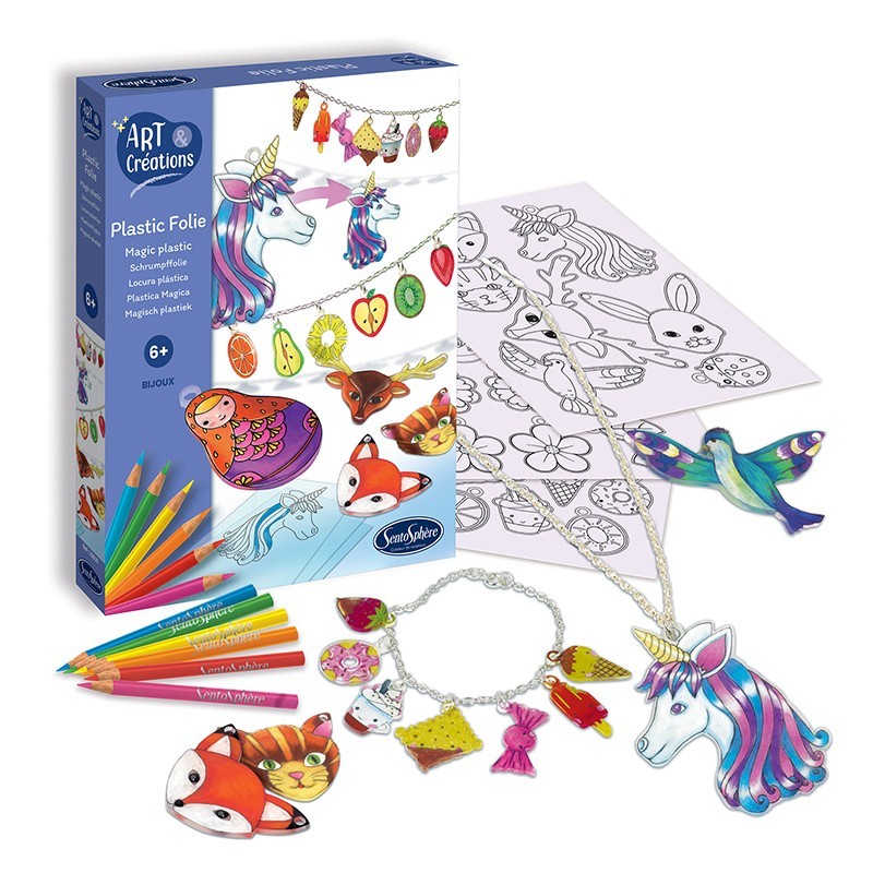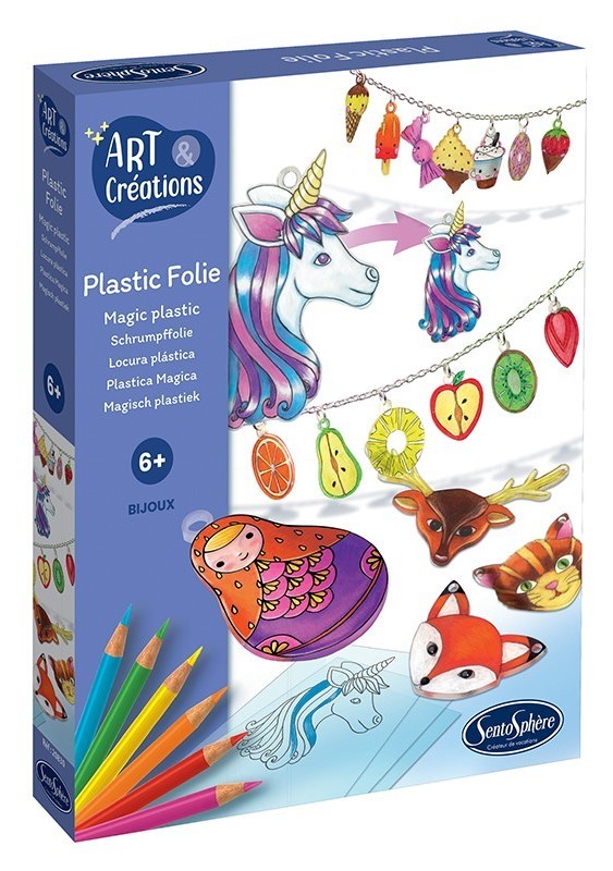 Distrează-te creând articole de bijuterii din plastic termocontractabil! Colorează desenele imprimate și predecupate pe foile de plastic înainte de a le introduce la cuptor la 180°C.