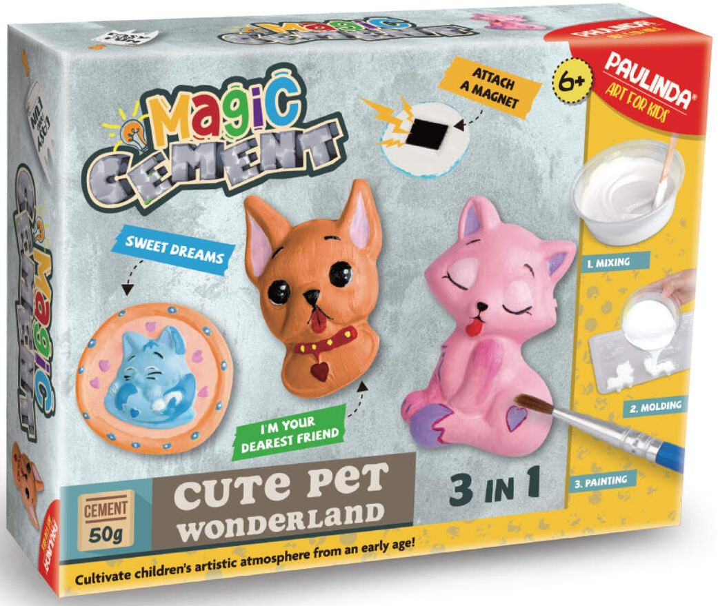Un produs ideal pentru dezvoltarea abilităților manuale și stimularea creativității. De asemenea, dezvoltă stimularea senzorială, datorită culorilor și texturilor diferite. Pur și simplu amestecați cimentul cu apă, turnați-l în matriță și lăsați-l să se usuce complet. Distracția constă în pictarea figurinei în mod individual, care poate deveni o decorare. Datorită magnetului inclus, figurina poate fi plasată pe suprafețe magnetice.