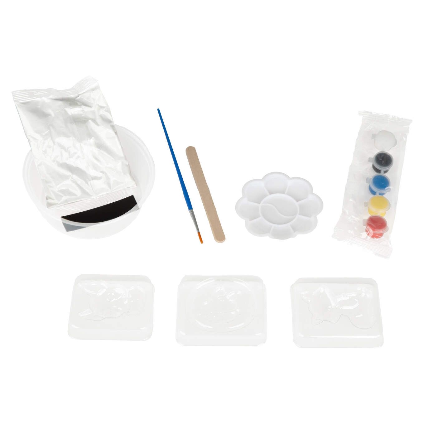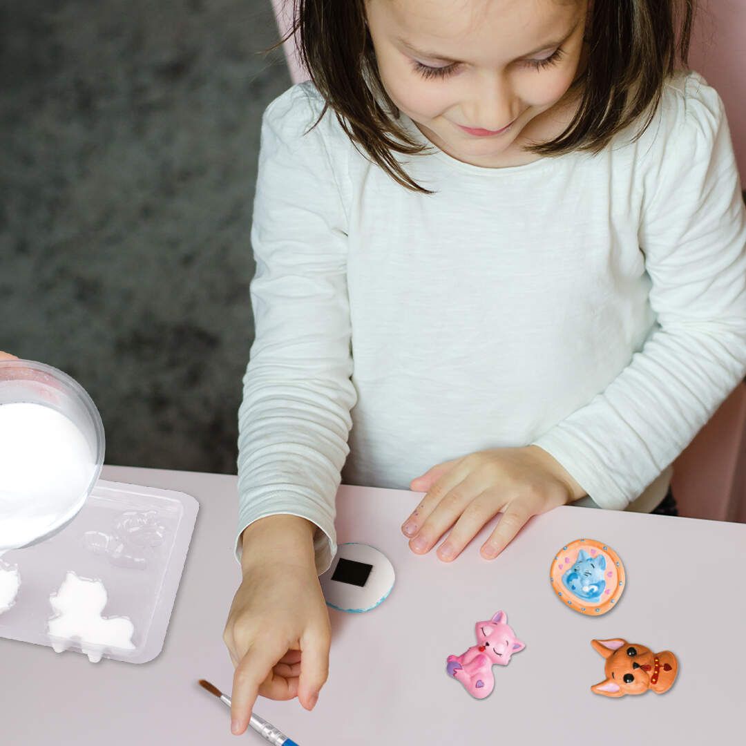 "CIMENT MAGIC", matrițe din plastic, magneți, pigmenți, pensulă, paletă, bol, agitator.
