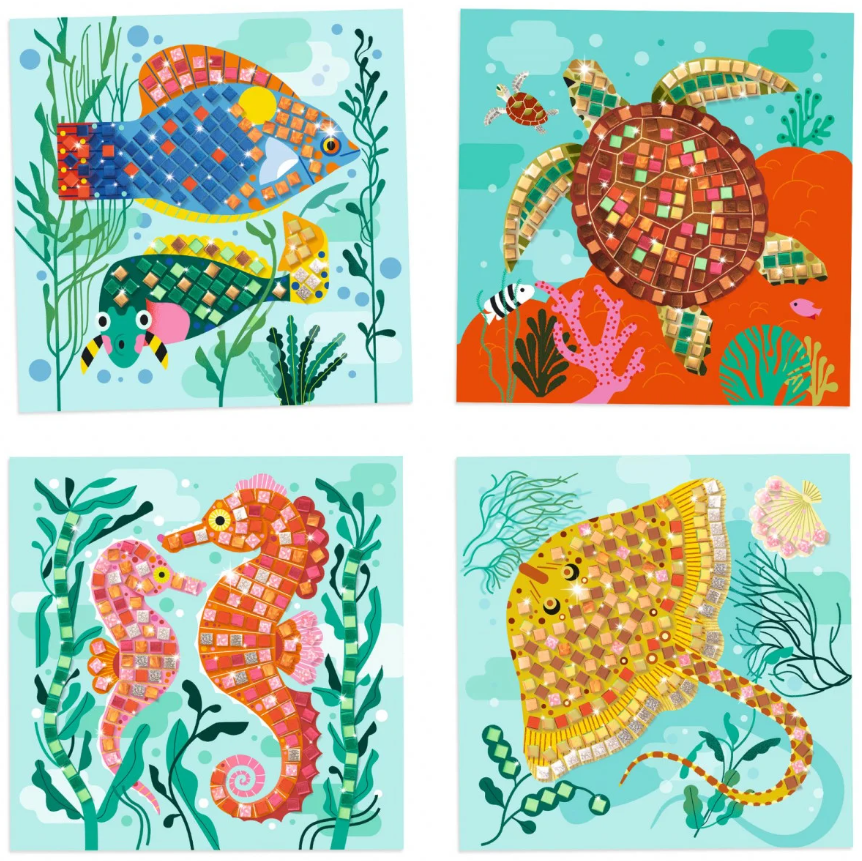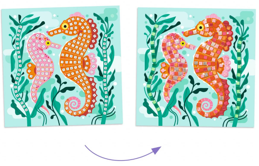 Un set care prezintă arta mozaicului pentru începători. 4 planșe care pot fi decorate prin lipirea unor mici pătrate de spumă metalică. Căutați numerele și lipiți piesele care se potrivesc cu zona potrivită. Pe măsură ce spațiile se umplu, lumea oceanului strălucește cu raze de lumină strălucitoare.