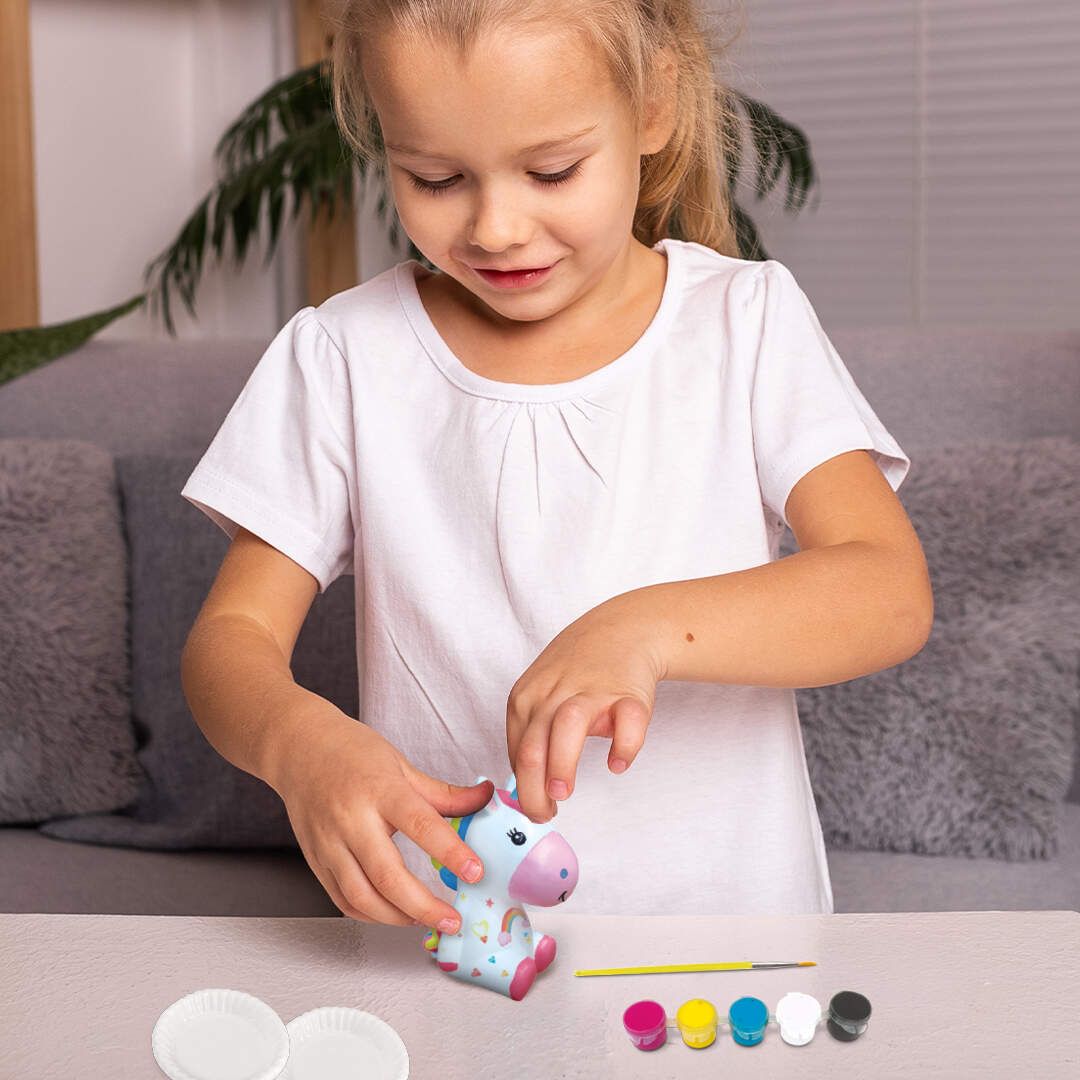 Setul include: figurina din ghips Unicorn, vopsele, pensulă și paletă.