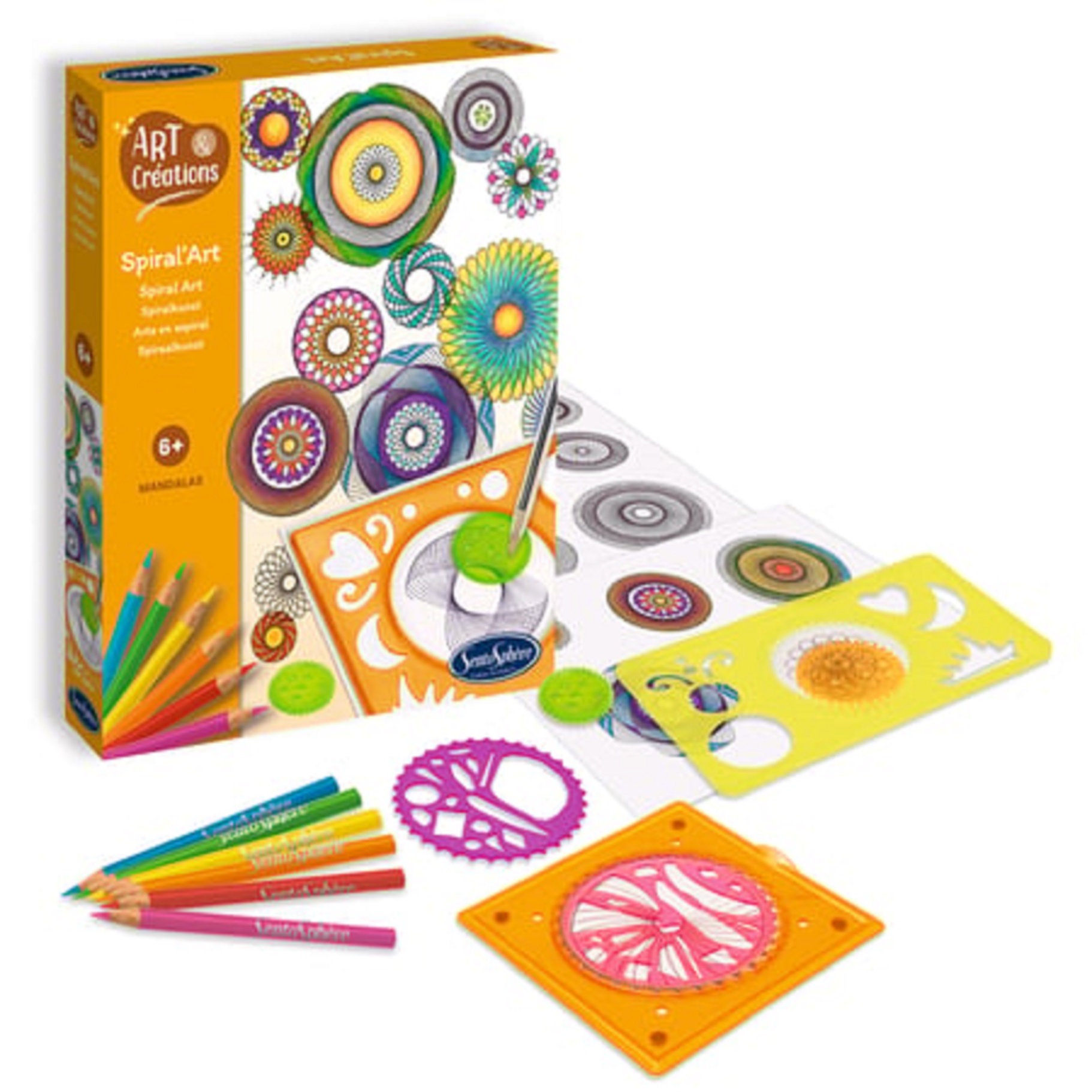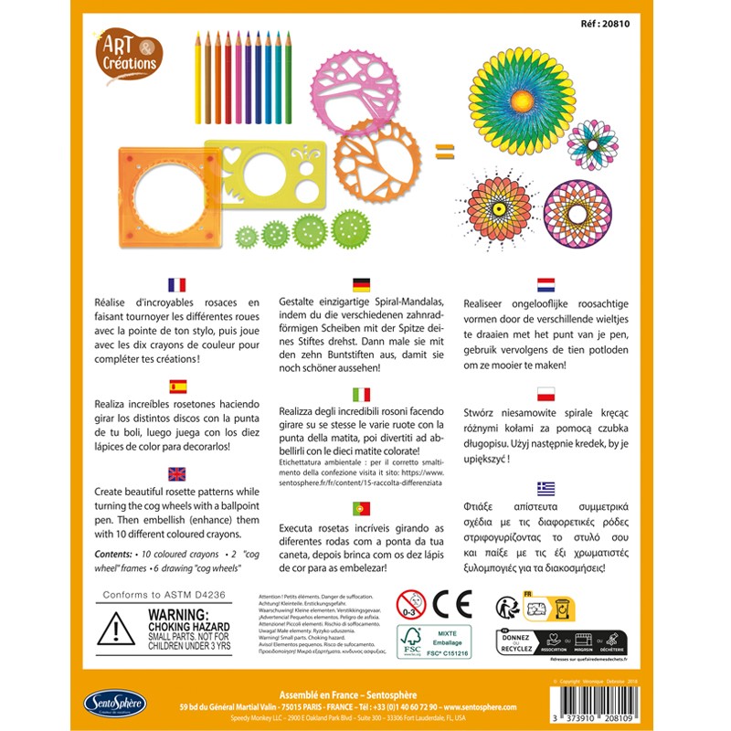 Realizați superbe spirale și rozete colorate jucandu-vă cu diferitele cercuri zimțate și creioanele colorate din acest set!