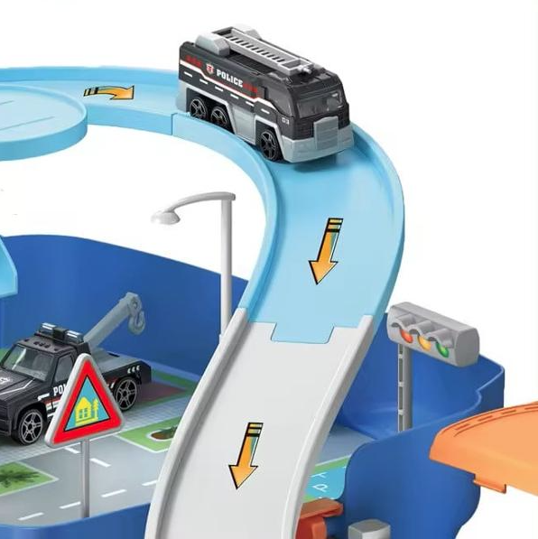 Setul contine 3 masini, un elicopter si traseele de construit pentru asamblarea statiei de politie.