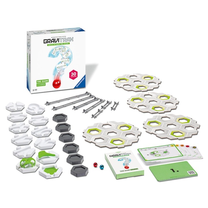 Contine: 1 brosura de instructiuni si solutii, 30 carduri de sarcini, 6 carduri tutorial, 4 piese hexagonale, 1 piesa de pornire, 2 bile, 6 elemente inaltare mari, 8 piese curba diferite, 2 sine lungi, 2 sine medii, 3 sine mici, 1 piesa comutator, 1 piesa 3 in 1, 1 piesa de baza, 1 piesa tinta, instructiuni prin imagini.