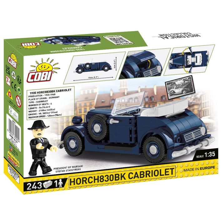 Decapotabilul Horch830BK realizat la scara de 1:35 este un alt set care onorează istoria industriei auto! Utilizarea elementelor special concepute pentru nevoile vehiculelor face ca modelele COBI să fie foarte atractive și le ajută să prezinte multe detalii surprinzătoare. De remarcat în mod deosebit sunt imprimeurile precise în locul autocolantelor folosite în trecut. Modelul Horch830BK este mult mai scurt decât limuzina, care a fost condusă, printre altele, de generalul De Gaulle.