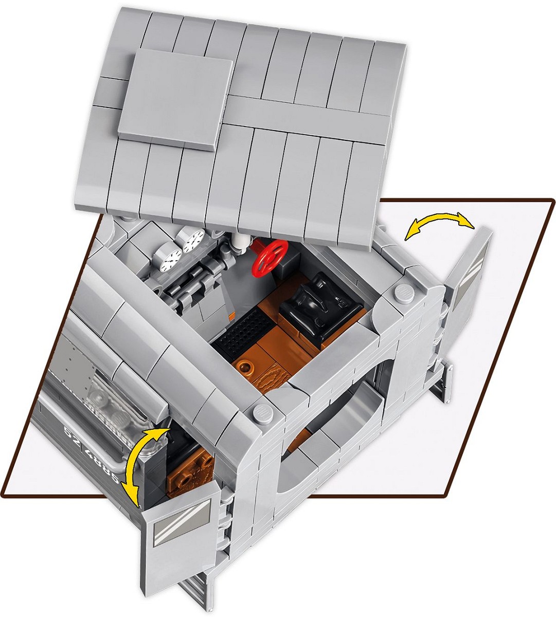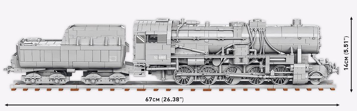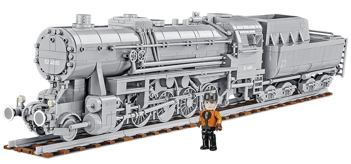 Set de construcție locomotivă cu abur Kriegslokomotive Baureihe 52 din al Doilea Război Mondial face parte din noua colecție „Trenuri” din catalogul COBI. Designul blocului reproduce cu fidelitate caroseria, proporțiile și detaliile legendarei locomotive cu abur, care este probabil cea mai populară și cea mai recunoscută pentru toate vehiculele feroviare din lume.