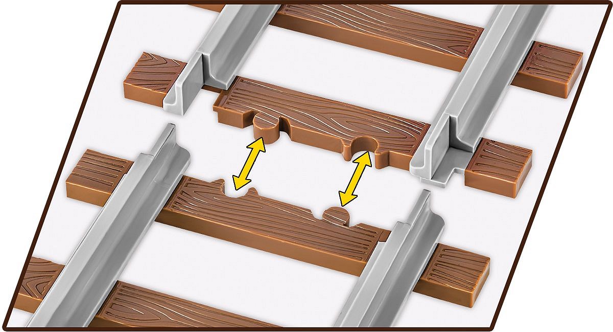 De asemenea, compania COBI a produs propria formă de bloc recreând o secțiune a pistei. Setul include cinci astfel de secțiuni cu o lungime totală de aproximativ 65 cm. Piesa este realizată cu tehnologia modernă de injecție în două culori, ceea ce înseamnă că fiecare secțiune este realizată din două culori diferite de plastic care sunt conectate între ele. Șinele de culoarea oțelului gri se evidențiază în mod clar de legăturile de cale ferată maro foarte realiste. Pe fiecare cravată nu sunt vizibile știfturi, ceea ce le îmbunătățește realismul, iar fiecare dintre ele este acoperită cu o textură de scândură, o imitație a granulelor lemnului. Șenile pot fi atașate de plăci bloc și au o gaură fizică, datorită căreia puteți atașa permanent șenila la orice afișaj pe care îl creați. Acest set este cadoul perfect pentru orice pasionat de istorie și cale ferată. Construiește istorie, bucată cu bucată, cu COBI!
