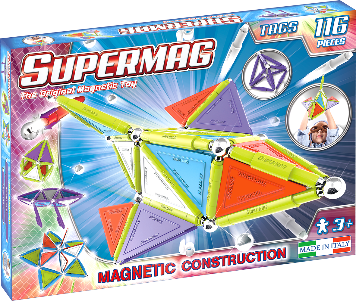 Aceste noi piese inovatoare ale sistemului magnetic Supermag stimuleaza creativitatea copiilor in mai multe feluri, oferind atat o functionalitate utila, cat si un plus de creativitate in timpul jocului, prin culori diferite si multiple combinatii de utilizare, aducand astfel un plus de culoare si diversitate experientei de joaca. Linia Supermag Tags ofera copiilor posibilitatea de a experimenta o varietate noua si nelimitata de constructii: suprafetele si volumele prind contur prin utilizarea a doua sisteme de asamblare distincte, dar perfect integrate.