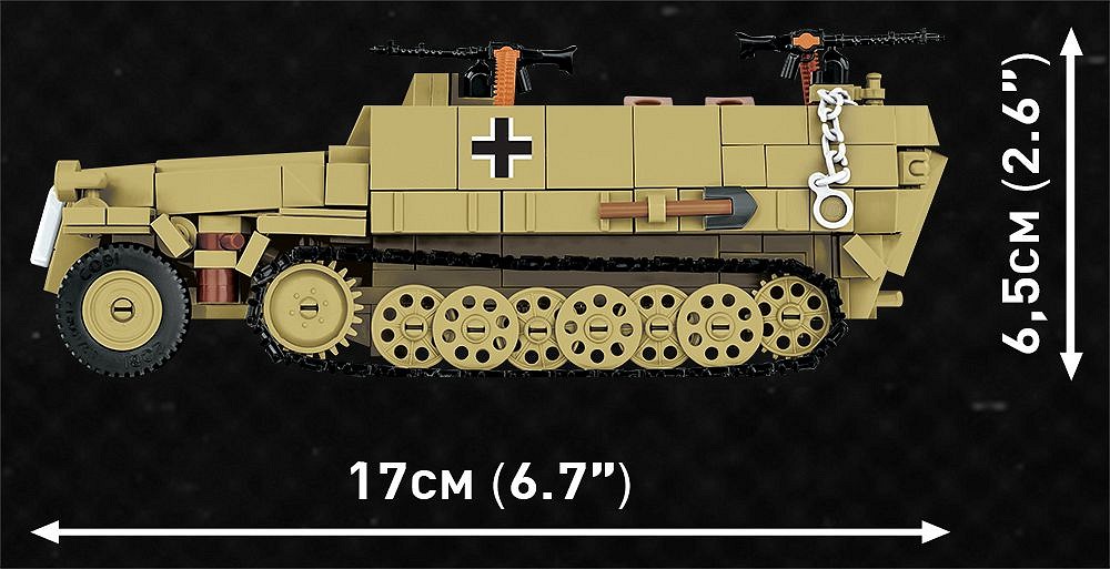 Transportorul blindat semi-senal Sd. Kfz. 251 Ausf. D a fost reprodus fidel folosind blocuri de construcție COBI. În set, blocurile au o culoare complet nouă, introdusă pentru un design și mai bun al modelelor istorice! Nu există autocolante aici, folosim doar imprimeuri durabile și de înaltă calitate. Vehiculul este echipat cu roți în mișcare cu cauciucuri reale. Şenile, constând din blocuri realiste, funcționează și se comportă realist atunci când deplasați vehiculul. O ușă din spate care se deschide, două mitraliere și accesorii suplimentare fac transporterul și mai atractiv. Întregul set este completat de o figură a unui grenadier blindat cu imprimeuri față-verso. Soldatul este echipat cu o șapcă, o cărămidă care imită o bidon pentru o mască de gaz și o cantină, o curea de transport pentru o armă, un pistol mitralieră MP 40 și un lansator de grenade Panzerfaust. Setul a fost dezvoltat cu atenție la detalii și este o altă mare dezvoltare a popularei colecții istorice!