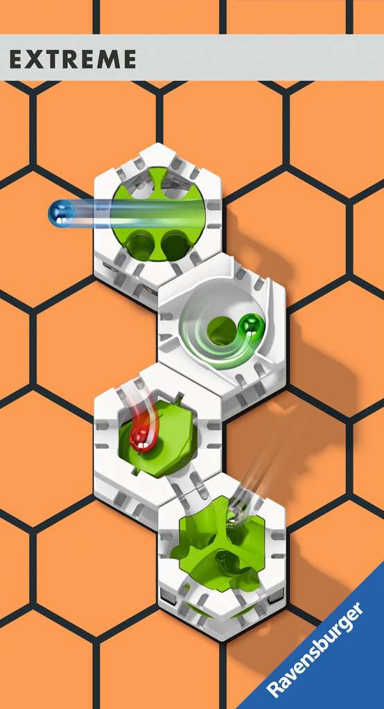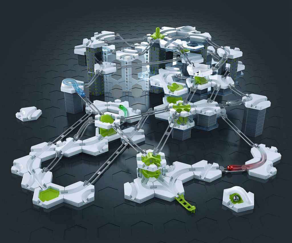 1 Instrucțiuni, broșură de plan de construcție, 6 plăci de bază, 2 nivele transparente mari, 2 nivele transparente mici, 6 bile, 1 tun magnetic, 1 Splitter, 1 Mixer, 1 Turntable, 1 3D Crossing, 1 Spinner, 35 de curbe, 4 curbe noi țigle, 5 joncțiuni, 2 întrerupătoare, 1 bloc 3-în-1, 1 vortex, 3 șine lungi din plastic, 6 șine medii din plastic, 15 șine scurte din plastic, 8 șine Bernoulli din plastic scurte, 1 perete mediu, 6 stâlpi, 4 balcoane, 2 balcoane duble, 1 linie de sosire, 4 plăci de bază, inserții pentru plăci de bază: 2 prindere, 1 cădere liberă, 1 stropire, 1 aterizare