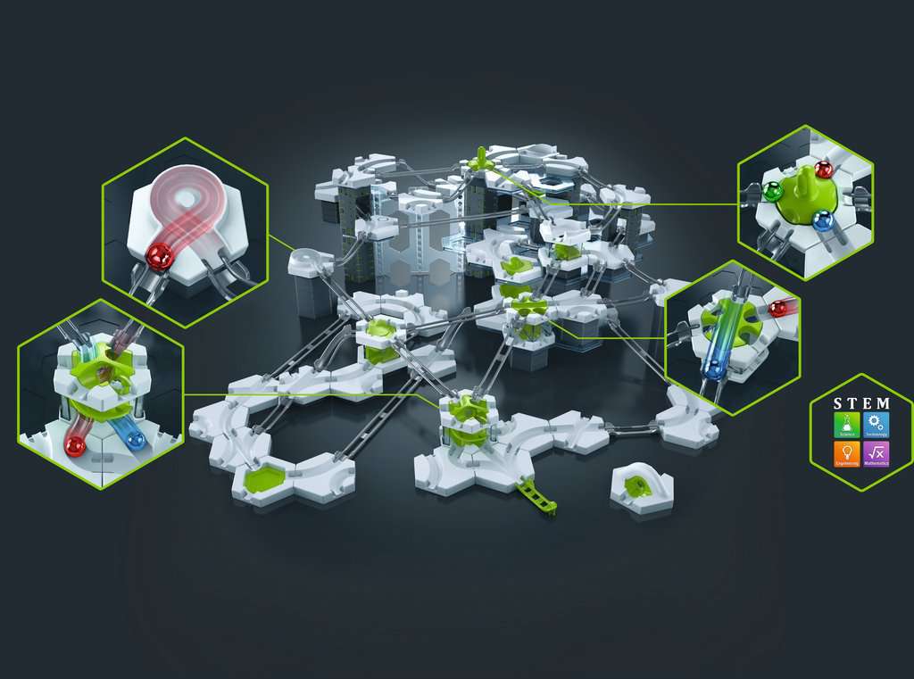 Seturile de construcție GraviTrax sunt un sistem creativ, modular, extensibil, care provoacă copiii să-și folosească imaginația și conceptele prietenoase cu STEM pentru a proiecta și construi propriile piste de marmură!