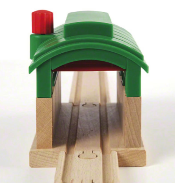 Garaj pentru trenuletele, cu usi mobile actionate cu buton BRIO, cu acest set din lemn iti completezi traseul si ii poti da forma dorita.