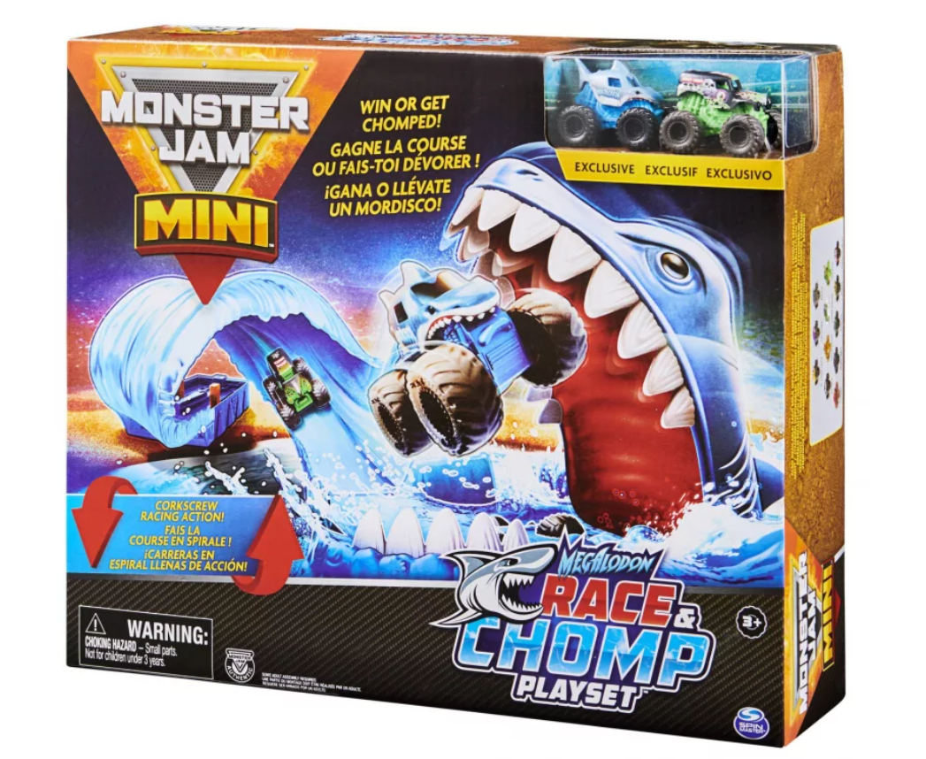 Cu atât de multe camioane Monster Jam Mini de colectat, adaugă Max-D, El Toro Loco și multe altele (fiecare vândut separat) la colecția ta și concurează-le pe toate! Aduceți acțiunea Monster Jam acasă cu setul de joc Megalodon Race și Chomp!