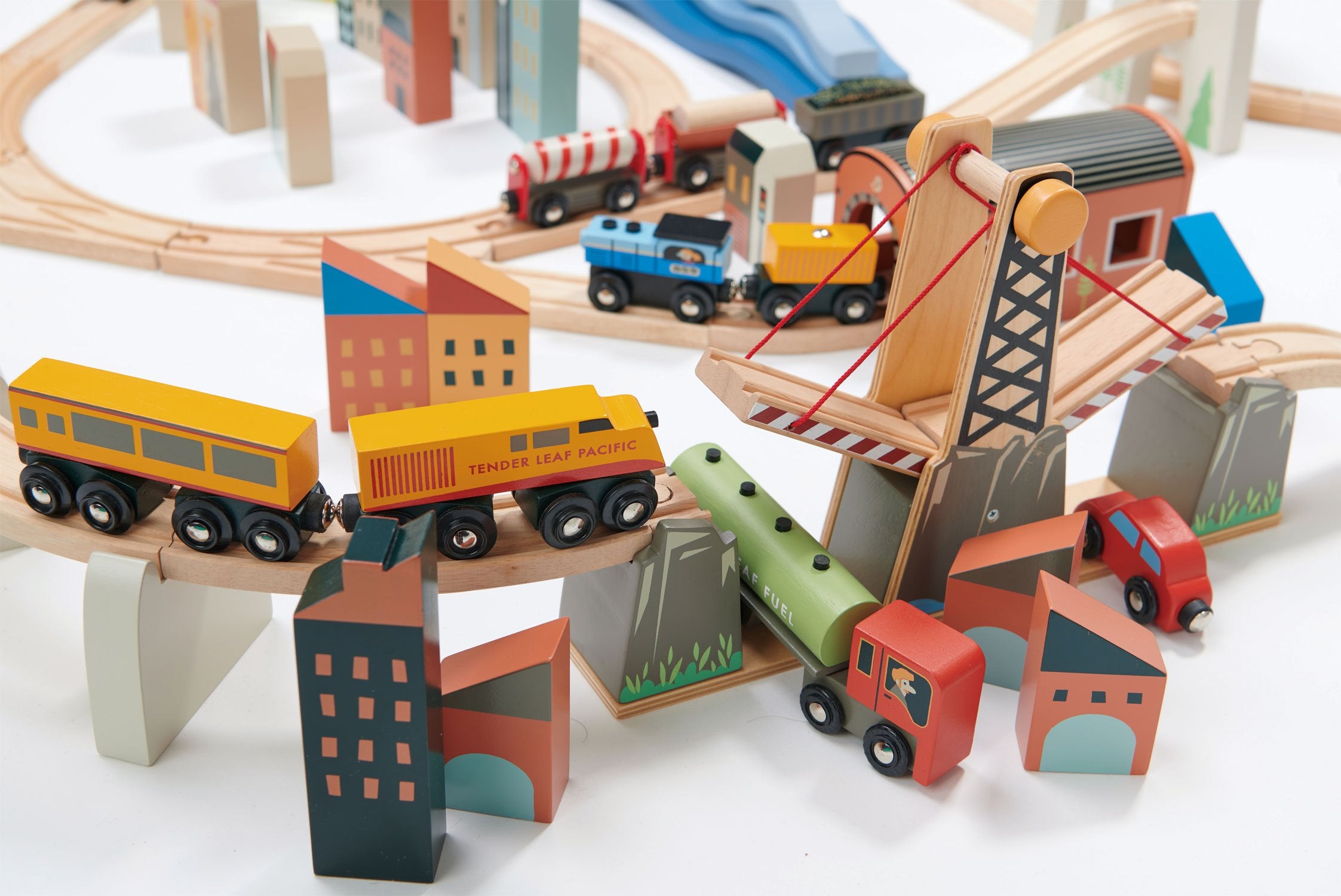 Accesoriile care se misca includ o locomotiva si 3 vagoane, care detin 27 de busteni mici de diferite culori, un camion forestier care transporta 9 busteni de cherestea magnetici, un vehicul de incarcare care poate ridica magnetic bustenii pentru ai incarca in camion.