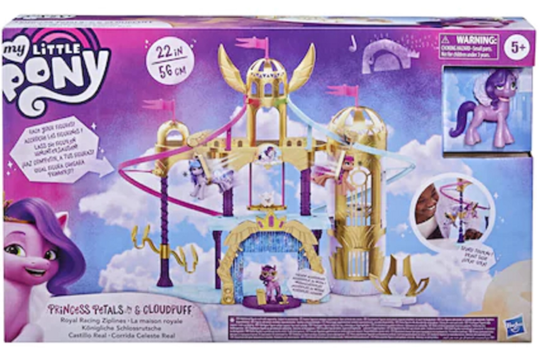 Fa cunostinta cu Princess Petals: un Pegasus din Zephyr Heights! Princess Petals este un star pop elegant si talentat. Imagineaza-ti ca se pregateste de cel mai extraordinar spectacol cu Royal Racing Ziplines. Inspirat de castelul din Zephyr Heights din filmul My Little Pony: A New Generation, acest set castel pentru fete si baieti are o inaltime de 56 cm. Ataseaza figurinele ponei Princess Petals si animalul de companie Cloudpuff la tiroliene. Apoi, da-le drumul de pe cel mai inalt turn al castelului pana pe scena!