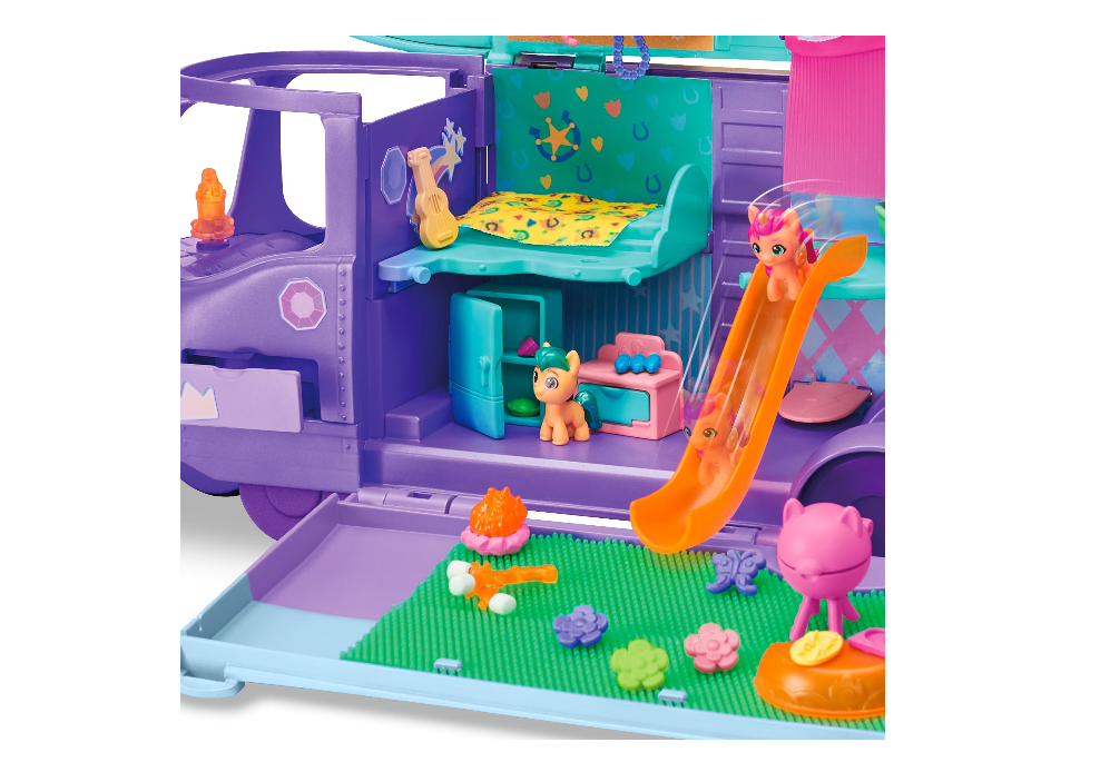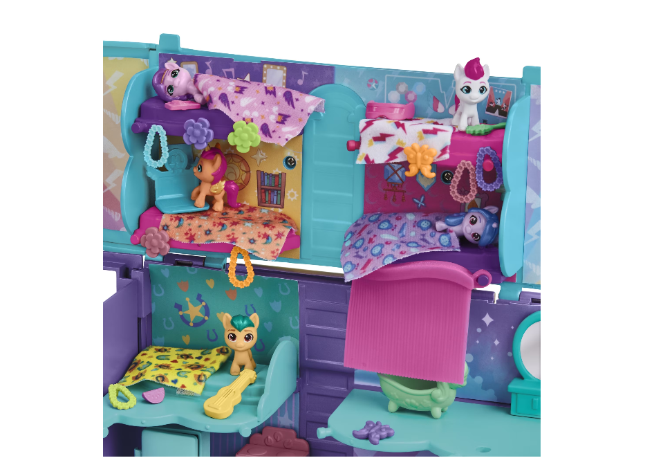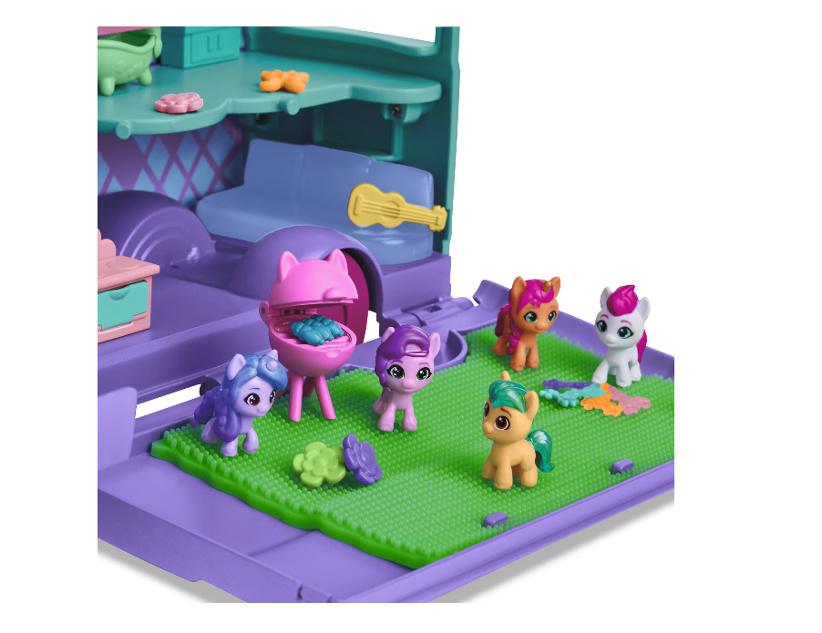 Vine impreuna cu 60 de piese pentru personalizarea scenei din interiorul acestei mici dubite. Conectati accesoriile si piesele de constructie ale scenei in setul de joaca pentru a crea o lume mini cu dormitoare, bucatarie, baie, curte in aer liber si multe altele. Include accesorii tactile, distractive, cum ar fi iarba "squishy" si paturi moi. Totul se potriveste in interiorul carcasei de transport pentru distractie in miscare. Conecteaza alte seturi Mini World Magic impreuna pentru a construi lumea Equestria!
