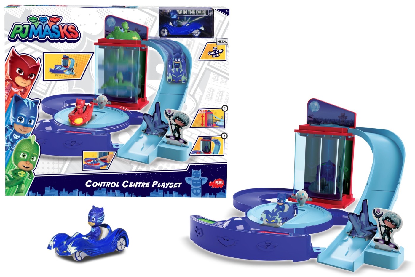 Centrul de comanda Eroi in Pijamale, cu multe functii distractive, cu lift si o masinuta de metal Cat inclusa si figurina, scara masinuta.