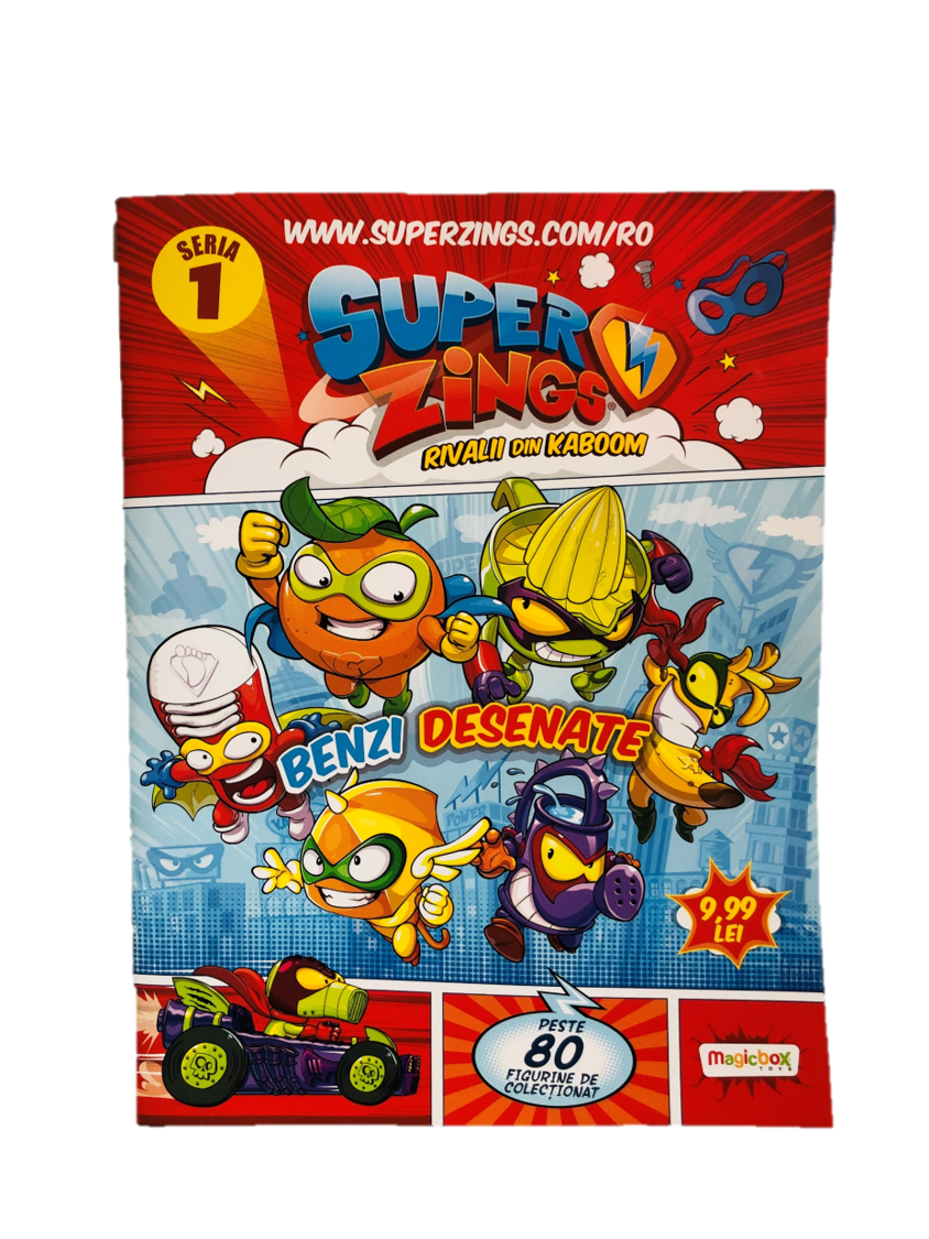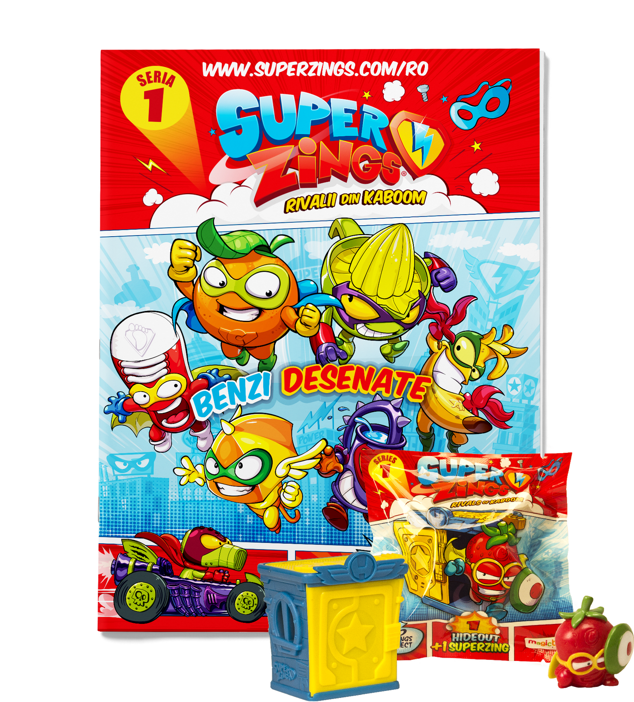 Pachetul cu revista si jucarie de la SuperZings seria 1 este jucaria perfecta cu care sa iti incepi colectia SuperZings. Revista contine 24 de pagini de rasfoit si multe detalii despre echipele personajelor SuperZings, puterile acestora, dar si o minunata poveste in care aflam prin ce nazbatii trec eroii, ce planuri malefice pregatesc raufacatorii si cum le vor tine piept eroii pentru a salva orasul Kaboom. Pentru si mai multa distractie, in interiorul revistei putem descoperi un poster de colectibilitate!