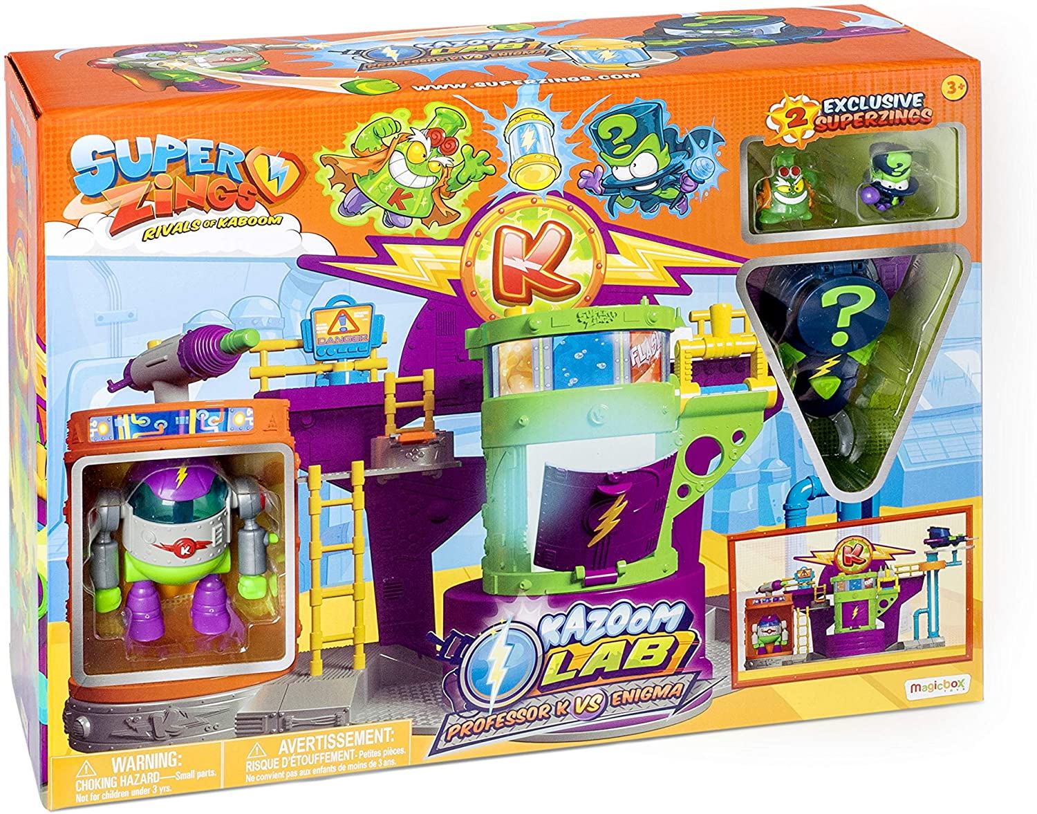 Acest set de joaca este perfect pentru cei mai mari fani SuperZings, dar si pentru fanii care abia isi incep colectiile si doresc sa aiba figurinele exclusive din seria 1 si seria 2, pe Enigma si pe Profesorul K. Batalia finala dintre Profesorul K si Enigma a inceput. Poate Enigma sa gaseasca si sa fure Kazoom-ul ascuns in Laborator? Robotul Profesorului K, modelul Robok 3000 controlat de profesorul K va face orice este posibil ca sa o opreasca pe Enigma. Poate Enigma sa evite capcanele ascunse in laborator si sa ajunga la pretiosul elixir? Daca reuseste, atunci poate lua nava AeroEnigma si sa scape din laborator. Multa actiune si distractie! Setul de joaca contine: 1 Laborator, 1 Robot Robok 3000, 1 nava Enigmei, 1 figurina Enigma, 1 figurina profesor K.