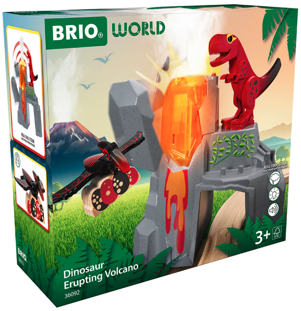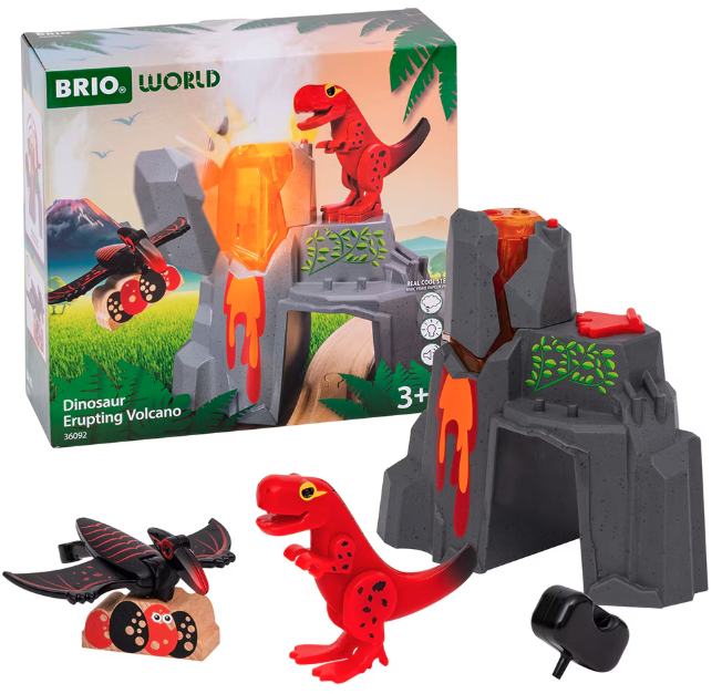 Vulcan in eruptie cu figurina dinozaur pentru trenulete BRIO, cu acest set din lemn iti completezi traseul si ii poti da forma dorita.