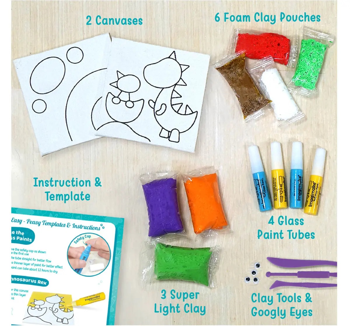 Set creativ care îi învață pe copii să realizeze dinozauri. Activitatea constă în pictarea șabloanelor și modelarea argilei pentru un efect 3D.