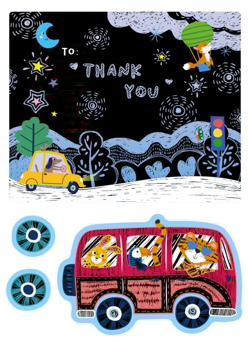 Tot ce este necesar este inclus în pachet pentru a realiza felicitări minunate care exprimă imaginația și creativitatea copilului, spre încântarea celor care le primesc.