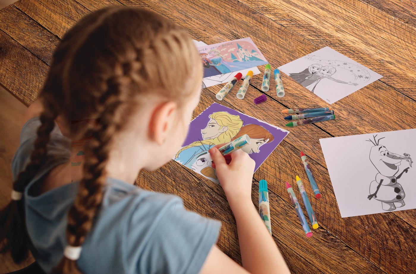 Contine: 10 pagini preimprimate si 10 pagini goale, 6 creioane colorate, 6 markere, 2 foi de sablon, 2 foi de autocolante si o figura de desen pe hartie 2D.