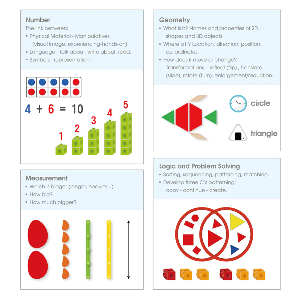 Setul contine 60 x forme de construit, 200 x pioneze de joaca, 1 x tabla pentru pioneze, 36 x margele, 2 x fire pentru snuruit, 25 x carduri de activitati, dublu fatetate si un ghid de activitati. Este un set destinat prescolarilor care explica, prin activitati, logica numerelor, notiuni simple de geometrie si care face apel la gandirea logica. Notiuni care se pot dobandi: formele 2D si 3D, simetrie, notiuni despre spatiu si pozitionare, coordonare, asociere. Produs cu activitati destinate varstei 4+.