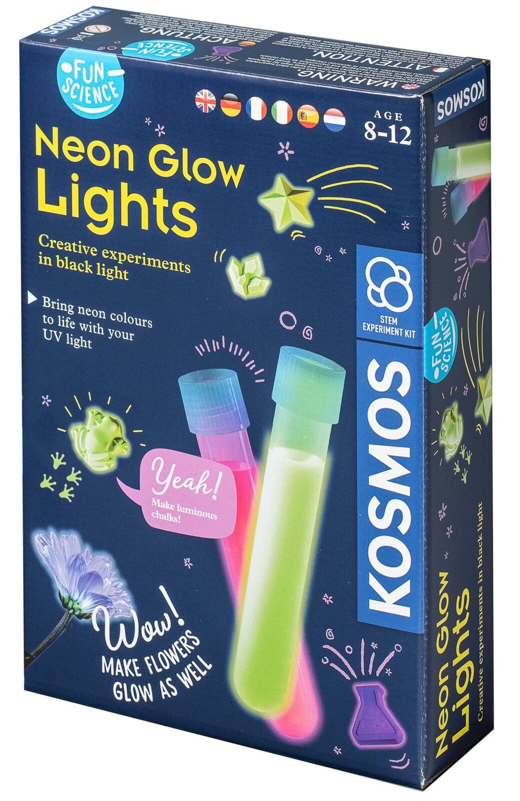 Chimia devine distractivă cu kitul Neon Glow Lights/ Laboratorul fosforescent în timp ce învățați despre lumină, fosforescență și materiale strălucitoare.