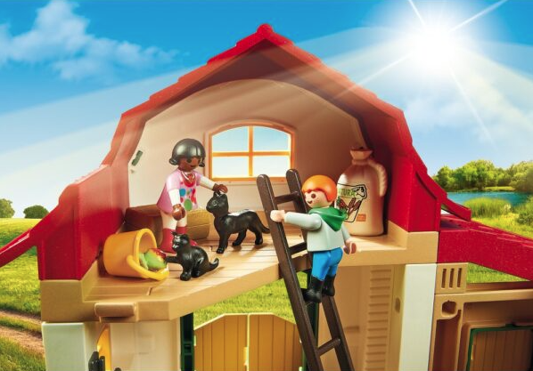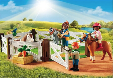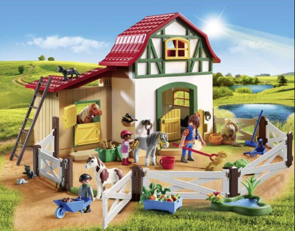 La ferma de ponei Playmobil, cu boxe pentru ponei si pod pentru depozitare, este timpul sa te ocupi de caii tai impreuna cu prietenii!